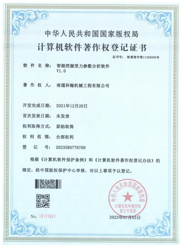 南通科翰機械工程有限公司 >> 榮譽資質 >> 智能挖掘受力參數分析軟件V1.0