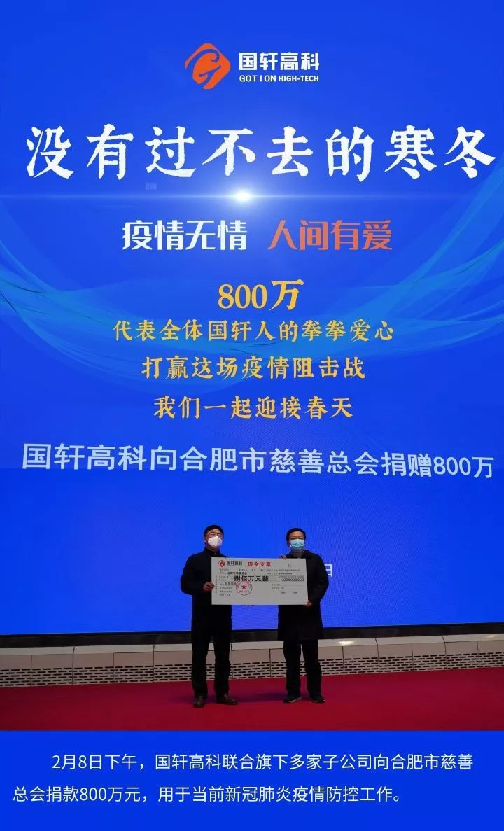 2月8日下午,國軒高科(002074)聯合旗下多家子公司向合肥市慈善總會捐贈800萬元,用于當前疫情防控工作。國軒高科董事長李縝表示,此次向合肥市慈善總會捐款,希望可以為打贏疫情阻擊戰盡一份綿薄之力。