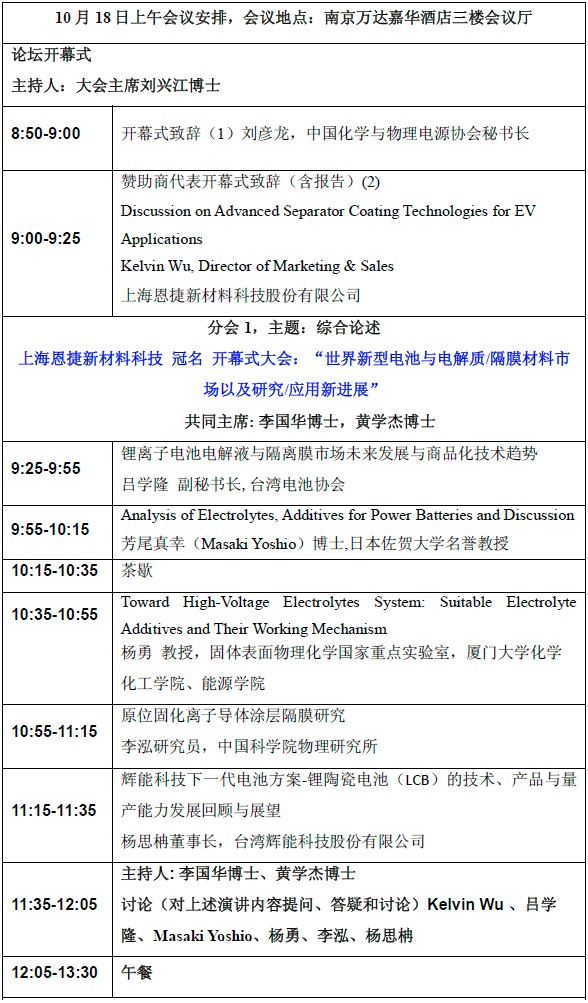以大會演講方式進行,并設有中英文現場同聲翻譯(第一天大會場、第二天分電解液、隔膜分會場)。