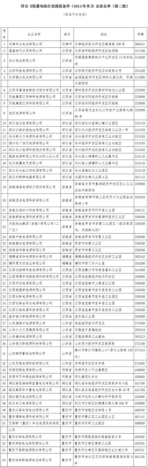 符合《鉛蓄電池行業規范條件(2015年本)》企業名單(第一批)