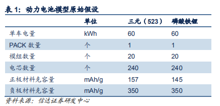我們假設單車帶電量 60kWh,包括 1 個電池包,20 個模組和 240 個電芯,以上假設主要用于測算模組和 PACK 組件成本。我們選取三元動力鋰電池 523 型和磷酸鐵鋰電池作為研究對象進行分析比較。參考當升科技公告數據,我們假設三元(523)正極材料實際克容量為 157mAh/g。參考國軒高科和豐元股份公告數據,目前國內磷酸鐵鋰正極材料實際克容量基本已經達到 150mAh/g,我們取 145mAh/g 的平均水平作為磷酸鐵鋰正極材料實際克容量假設。參考杉杉股份公告數據,我們假設負極活性材料(人造石墨)實際克容量為 350 mAh/g。