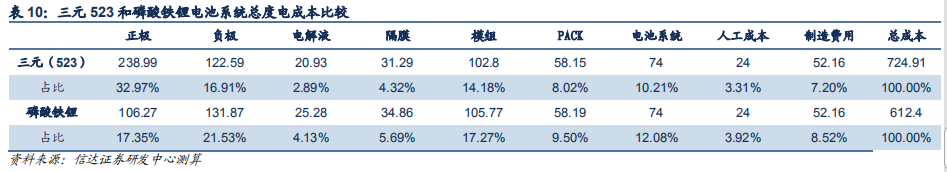 在考慮模組、PACK 及電池系統的情況下,三元 523 和磷酸鐵鋰電池系統的總度電成本分別為 724.91 和 612.40 元/kWh。