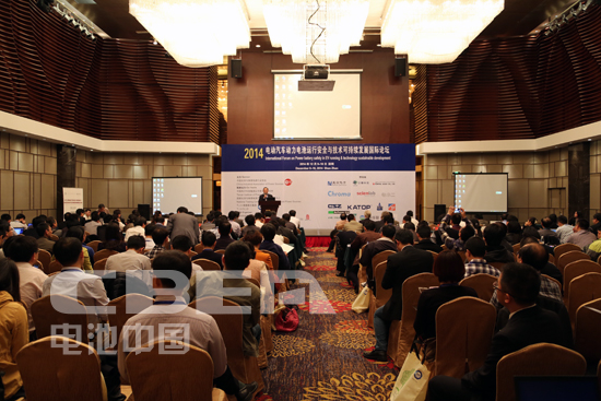 圖為2014電動(dòng)汽車動(dòng)力電池運(yùn)行安全與技術(shù)可持續(xù)發(fā)展國(guó)際論壇會(huì)議現(xiàn)場(chǎng)