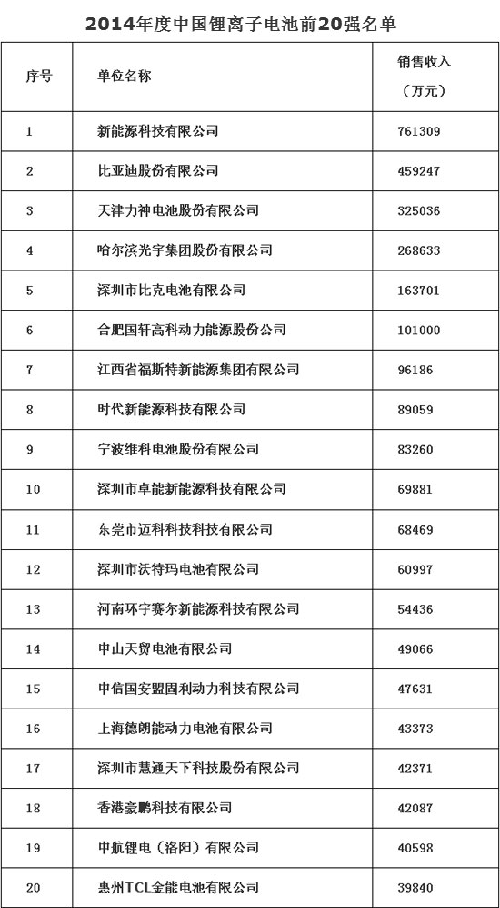 近日,中國(guó)化學(xué)與物理電源行業(yè)協(xié)會(huì)發(fā)布我國(guó)“2014年度鋰電行業(yè)20強(qiáng)企業(yè)名單”。新能源科技有限公司、比亞迪股份有限公司、天津力神電池股份有限公司分列該榜單的前三位。