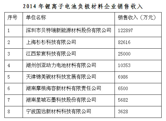 8家鋰離子電池負極材料企業2014年總產量52858噸,總銷量47778噸,全年實現銷售收入26.36億元;出口負極材料18818噸,實現出口額9.5億元。