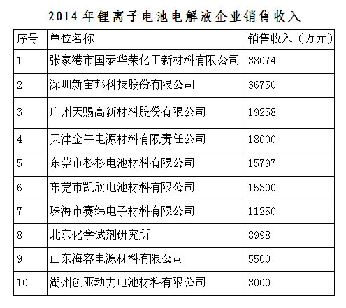 10家鋰離子電池電解液企業在2014年全年共實現銷售收入17.19億元。其中全年總產量37241噸,總銷量36761噸;出口電解液3891噸,出口額2.62億元。