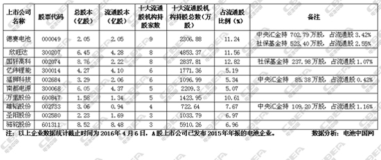 [摘要]截至2016年4月6日收盤,A股上市電池企業已公布2015年年報的有10家。根據年報數據顯示,這10家電池企業的前十大流通股股東中,均有機構投資者身影出現。