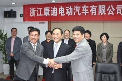 浙江康迪車業有限公司和吉利汽車旗下子公司上海華普國潤汽車有限公司于2013年3月22日下午在中國浙江省杭州市西湖區正式簽署合資協議,成立浙江康迪電動汽車有限公司(以下簡稱合資公司)。合資公司注冊資本為人民幣10億元,將由上海華普國潤及康迪車業分別擁有50%權益,以從事投資、研發、生產、市場推廣及銷售電動汽車業務。