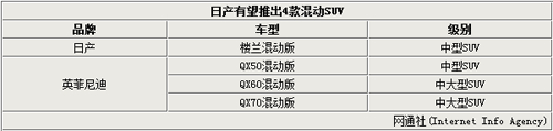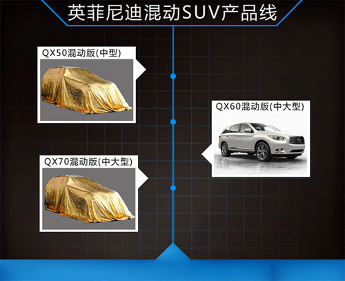 日產(chǎn)汽車(chē)此前計(jì)劃在2016年將推15款混動(dòng)車(chē)型,該計(jì)劃將涉及到日產(chǎn)和英菲尼迪兩大品牌。日產(chǎn)負(fù)責(zé)全球產(chǎn)品業(yè)務(wù)的執(zhí)行副總裁Andy Palmer曾表示:為了避免同已經(jīng)占領(lǐng)市場(chǎng)的歐洲豪車(chē)直接競(jìng)爭(zhēng),英菲尼迪將采用差異化策略,打造一系列混合動(dòng)力車(chē)型,包括注重運(yùn)動(dòng)性能的轎車(chē)、轎跑和跨界SUV等。未來(lái),日產(chǎn)旗下混動(dòng)SUV車(chē)型將增至4款。英菲尼迪中國(guó)事業(yè)部總經(jīng)理戴雷在接受采訪時(shí)曾表示:混合動(dòng)力是我們未來(lái)發(fā)展的一大重點(diǎn),會(huì)有多款使用此技術(shù)的新車(chē)型推出。除已確認(rèn)的QX60混動(dòng)版今年將在華上市外,其他三款SUV均有望入華銷(xiāo)售。