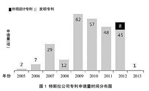 筆者使用國家知識產權局專利檢索與服務系統,以申請人、發明人、關鍵詞及IPC(國際分類號)為入口在中英文專利數據庫中進行了檢索。檢索結果表明,截至2014年6月21日,特斯拉公司在全球范圍內共公開了相關專利申請271項,其中發明專利申請263項,外觀設計專利申請8項。從圖1中所示專利申請時間分布的整體趨勢來看,特斯拉公司從2005年開始提交專利申請,初期申請數量較少,2009年達到最大申請量62項,可以看出其前期的投入在5年后才取得突破性進展,該公司也由此贏得了最佳融資時機,于2010年在美國上市。隨后該公司一直保持著較高的年專利申請量,每年的申請量均在40項以上。由于專利申請公開需要一段時間,2013年和2014年提交的專利申請數據目前還不能從數據庫中獲得,因此圖1中顯示的2013年和2014年申請數量較少。