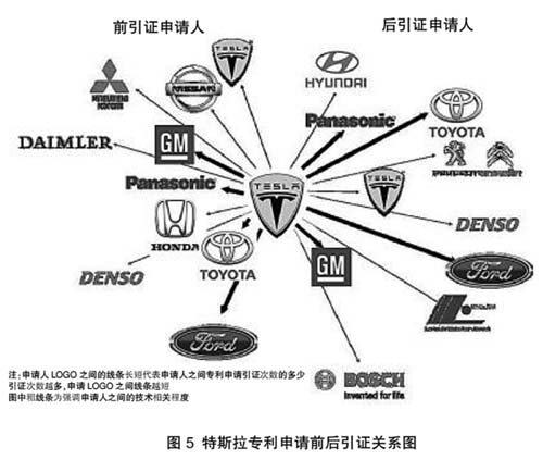 筆者又繼續對特斯拉公司與電動汽車相關企業的技術關聯性進行了研究。將特斯拉公司所持有的美國專利進行引證和被引證分析后,得出了如圖5所示的特斯拉專利申請前后引證關系圖。