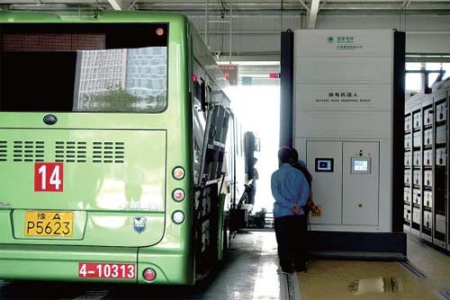 8月19日,記者在商都路汽車換電站見到了這種電動公交車。這種新型純電動公交車全長12米,純綠色流線型車身,它的強大“心臟”由9節(jié)大容量鋰電池組成,一次充換電續(xù)駛里程可達150公里。據(jù)介紹,這批車換電池不需要人工動手,公交車開到換電池的車間后,只需行駛到相應(yīng)軌道,換電機器人自動伸出“手臂”,將用過的電池取下,再將滿電的電池換上。整個過程換電時間只需8至10分鐘,公交車就可以開走繼續(xù)運行了。換下來的電池,則留在充電站里充電。