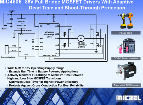 近日,高性能線性和電源解決方案、局域網(wǎng)以及時鐘管理和通信解決方案領域的行業(yè)領導者麥瑞半導體公司 (Micrel, Inc.) 推出一款 85V 全橋 MOSFET 驅(qū)動器 MIC4606,該驅(qū)動器具有自適應停滯時間和擊穿保護功能。這款元件是麥瑞半導體最初于2013年推出的極其成功的 85V MOSFET 驅(qū)動器系列的成員,專注于滿足多種應用不斷增長的電力需求。85V MIC4606 系列是麥瑞半導體為滿足電池供電的工具、不間斷電源、無線電控制的玩具和不斷增長的無人機市場的需求而實施的策略的一部分。