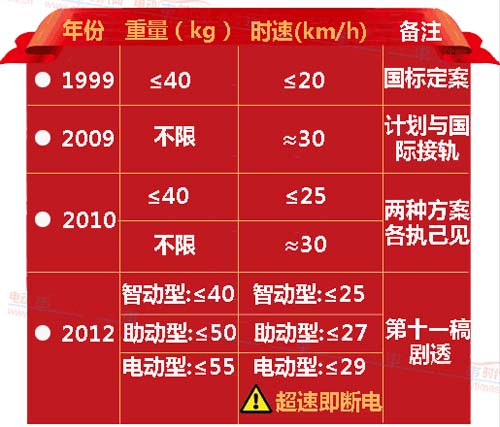 自2002年中國輕工業聯合會下達了GB17761-1999《電動自行車通用技術條件》國家標準的修訂任務(以下簡稱新電動自行車標準)以來,并要求2003年完成。迄今共經12年新國標一直遲遲未出,但其挑逗卻從未終止過,其中,關于新國標中里程時速的標準也是幾經更改,如下圖所示:
