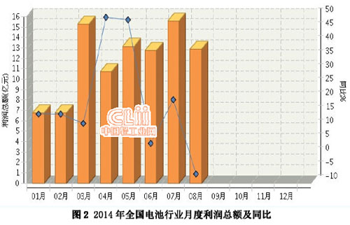 2014年1~8月,全國電池行業累計完成利潤總額同比增長16.68%。其中:8月份完成利潤總額12.86億元,同比下降6.75%。