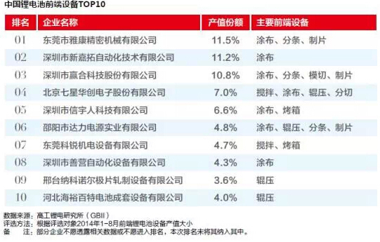高工鋰電產(chǎn)業(yè)研究所(GBII)經(jīng)過(guò)詳細(xì)深入調(diào)研,評(píng)選出2014年中國(guó)鋰電池前端設(shè)備TOP10企業(yè),以期對(duì)讀者有所裨益。