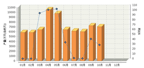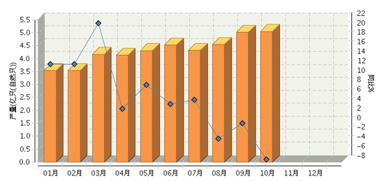2014年1~10月,全國鋰離子電池行業累計完成產量43.56億只(自然只),同比增長4.56%。其中:10月份完成產量5.05億只(自然只),同比增長-7.48%。