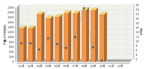 2014年1~10月,全國鉛酸蓄電池行業累計完成產量18,740.30萬千伏安時,同比增長10.00%。其中:10月份完成產量1904.61萬千伏安時,同比增長2.55%。