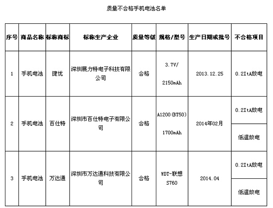 抽檢中發(fā)現(xiàn),標稱深圳展力特電子科技有限公司生產(chǎn)的一批次“捷優(yōu)” 手機電池被檢出0.2ItA放電項目不合格;標稱深圳市百仕特電子有限公司生產(chǎn)的一批次“百仕特” 手機電池、標稱深圳市萬達通科技有限公司生產(chǎn)的一批次“萬達通” 手機電池被檢出0.2ItA放電、低溫放電項目不合格。