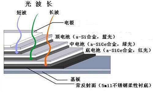 頂層使用非晶硅材料,光學(xué)能階間隙達(dá)1.8eV,利于吸收藍(lán)光。