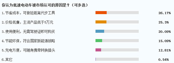 調查數據顯示,有26.17%的網友認為低速電動車普遍受到市場歡迎主要是因為在使用過程中可以“節省成本,并作為短距離代步工具”,這同時也是消費者對于低速電動車最基本的訴求。其次,有25.3%的網友選擇了“價格低廉,主流產品低于5萬元”這一選項,這基本上也符合低速電動車這一細分市場的定位。