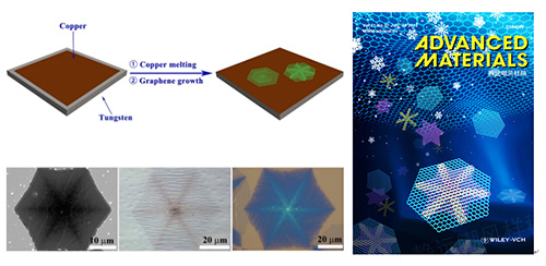 級次結構石墨烯的疊層生長:采用CVD方法,以液態銅為催化劑,以甲烷為碳源,通過調控Ar和H2流速的比例,獲得了一系列具有三維結構的石墨烯復合體(圖1左)。該復合體具有高度六重對稱性,并且具有明顯的級次層疊結構。該工作首次將石墨烯的三維生長和形貌調控與非平衡體系下動力學調控有機結合,原理上可推廣到其他二維原子晶體材料。另外,該級次結構的石墨烯復合體具有各向異性的電學性能。相關研究結果發表在《先進材料》上(Adv. Mater. 2014, 26, 3218.), 并被選為內封底(圖1右)。