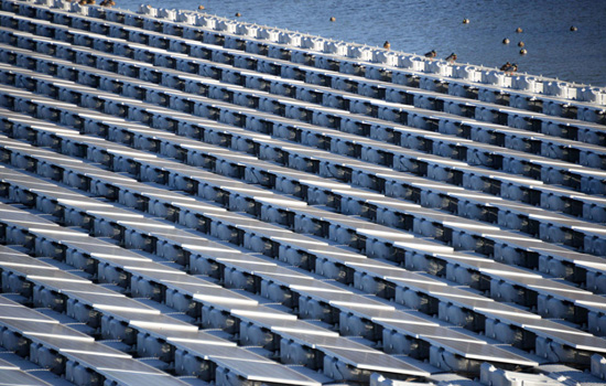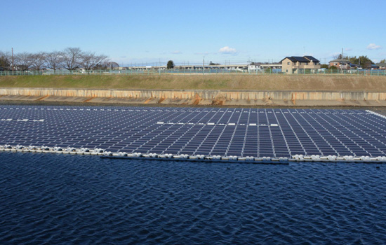 日本埼玉縣桶川市當地水庫內,目前已建設完成的水上太陽能發電站。12400平方米的水面上漂浮著4500塊太陽能電池板,而水面面積達3萬平方米的水庫,及其周邊河流充足的水源,都擁有良好的冷卻效果。