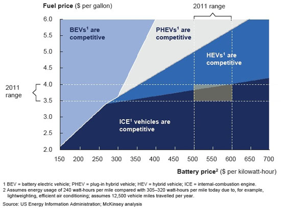 但這所謂的每千瓦時300美元,除了顯示電動車電池成本下降速度超乎預期外,是否還意味著電動車時代即將來臨呢?全球顧問公司麥肯錫(Mckinsey&Company)在2011年曾做了一張圖表,顯示不同的油價與電池價格情況下,純電動車、插電式混合電動車、油電混合車及一般汽車誰更具競爭力,灰色區塊的部分則是2011年的價格區間。從下圖圖表中可以看出,當電動車電池價格位于每千瓦時約300美元左右時,就是電動車競爭力逐漸起飛的時刻。
