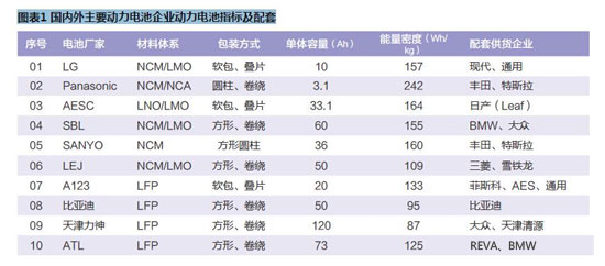 目前量產的鋰離子動力電池產品能量密度普遍偏低。國外以日本、韓國的企業為例,普遍采用層狀鎳鈷錳三元+尖晶石錳酸鋰體系正極材料,單體電池能量密度約160Wh/kg;而國內普遍采用橄欖石型磷酸鐵鋰為正極材料,單體電池能量密度不超過140Wh/kg。動力電池能量密度偏低問題制約了電動汽車的行駛里程,直接阻礙了純電動汽車的市場推廣。國內外主要動力電池企業已經量產能量型動力電池產品關鍵指標及配套供貨企業如下: