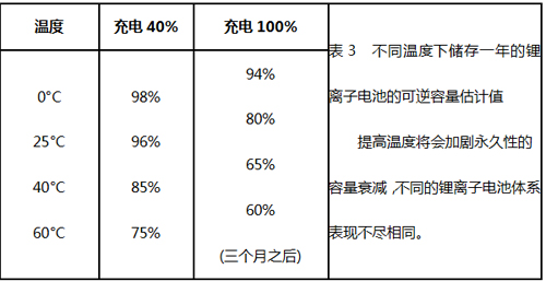 受熱或高充電電壓下也會(huì)使鋰離子電池承受更大的負(fù)擔(dān),30℃(86°F)對(duì)于大多數(shù)鋰離子電池來說已經(jīng)算是較高溫度了,4.10V/電池以上的電壓為高電壓。將充滿電的電池暴露在高溫下較長時(shí)間比電池循環(huán)次數(shù)增加對(duì)鋰離子的壓力還要大。表3表示了容量損失與溫度的函數(shù)關(guān)系。
