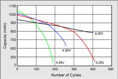 出于安全因素的考慮,許多鋰離子電池充電電壓并不能超過4.2V(高能量密度的三元材料電池是個(gè)例外,它的充電電壓為4.3V)。雖然較高的電壓將會(huì)大大增加電池的容量,但是高電壓會(huì)縮短使用壽命,并且降低安全性。圖5顯示了循環(huán)次數(shù)與充電電壓之間的關(guān)系,其中4.35V時(shí),循環(huán)次數(shù)縮短了一半。