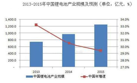 2014年1-12月,我國電池制造業主要產品中,鋰離子電池累計完成產量52.9億自然只,產量與上年持平;其中12月份當月完成產量4.8億自然只,同比下降12.3%。全球新能源汽車產業將在技術不斷成熟、政府扶持政策不斷落地的大背景下呈現出快速產業化的趨勢,另外,電動工具、電動自行車、新能源等產業也將在低碳經濟的背景下保持快速發展的勢頭。就中國市場而言,得益于動力鋰電池的快速發展,2014年鋰電池整體市場規模達到952.16億元,同比增長30.31%,到2015年整個中國鋰電池的市場規模將突破1000億元,達到1251.5億元。