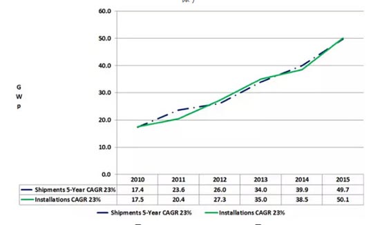 2010-2015全球太陽能光伏組件出貨量(數(shù)據(jù)統(tǒng)計(jì)范圍只限于第一手交易,買方包括安裝商、EPC、開發(fā)方、終端用戶、其他制造商、其他個體)