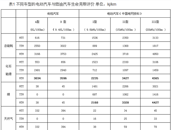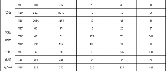 在我國2012年發電裝機和能源結構情景下,選取三種不同耗電特性的電動汽車計算燃料生命周期評價結果,分別是9.8kWh/100km (I 型)、15kWh/100km (II 型)、20kWh/100km (III型)和兩種不同油粍特性的燃油汽車,8L/100km (A型)(中國新發布的新生產汽車油耗標準)和9.48L/100km (B型)。參考實際車輛的情況,認為在汽車的驅動力和舒適性等性能比較上,III型電動汽車與B型燃油汽車相近,II型電動汽車與A型燃油汽車相近,I型電動汽車與1.0L排量以下的小型燃油汽車相近。查閱中國電網研究院資料,采用不同能源發電方式時的能耗和二氧化碳排放對比表如下: