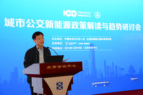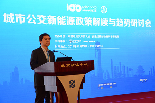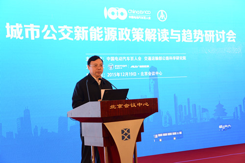 2015年12月19日,由中國電動汽車百人會與交通運輸部公路科學研究院聯合舉辦的“城市公交新能源政策解讀與趨勢研討會”在北京召開,國務院發展研究中心原黨組書記陳清泰、交通運輸部運輸服務司副司長王水平、工業和信息化部裝備工業司副巡視員瞿國春、中國道路運輸協會城市客運分會理事長張國光、中國電動汽車百人會執行副理事長歐陽明高等參加會議并講話。
