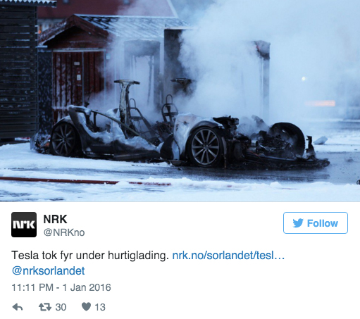 據(jù)外媒Fædrelandsvennen 的報道,周五早上一輛特斯拉Model S在超級充電站充電時突然起火。所幸事故發(fā)生后沒有人員傷亡。