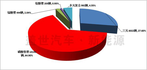 當(dāng)月所生產(chǎn)的純電動(dòng)客車,采用磷酸鐵鋰動(dòng)力電池的數(shù)量是14143輛,占據(jù)64.9%的份額,位居第一;三元材料動(dòng)力電池的裝機(jī)量為6022輛,占總份額的27.6%;多元復(fù)合材料動(dòng)力電池、錳酸鋰動(dòng)力電池、鈦酸鋰動(dòng)力電池所占當(dāng)月份額分別為4.55%、2.04%、0.93%。