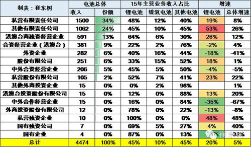 鋰電池行業(yè)的高增長主要是其他有限責(zé)任公司和港臺企業(yè)的表現(xiàn)很強(qiáng),收入高增長。而國企性質(zhì)的企業(yè)在新能源產(chǎn)業(yè)是較差的,沒有有效的產(chǎn)品投入。未來國企大汽車集團(tuán)可能有錢投資,但與民營相對的體制差距太大,估計也是很難發(fā)展。