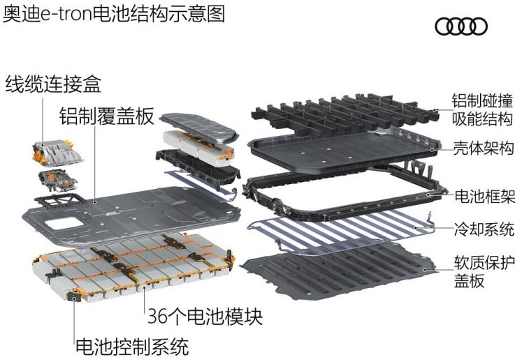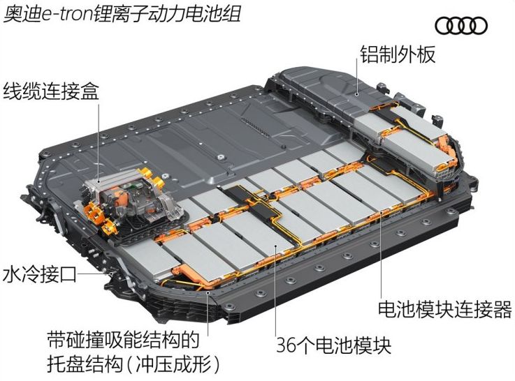 據此前報道,奧迪E-Tron的電池系統長2.28米,寬1.63米,高34厘米,共包括36個電池模組(每個模組由12個60Ah的電芯組成,電芯由LG化學提供),電池組容量為95kWh,車輛工況續航里程400公里。