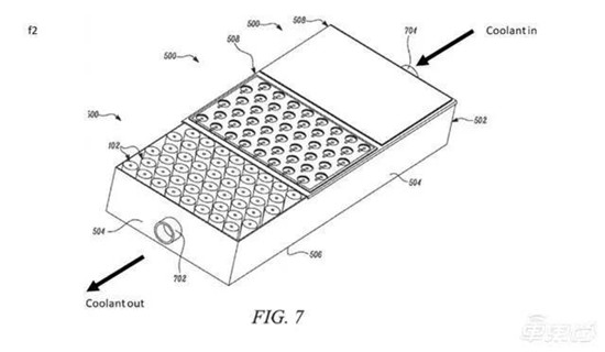在特斯拉的專利圖片中可以看到,特斯拉為電池組設計了兩個開口,液體可以流入和流出,能夠直接利用液體從電池組中經過來降低電池溫度。